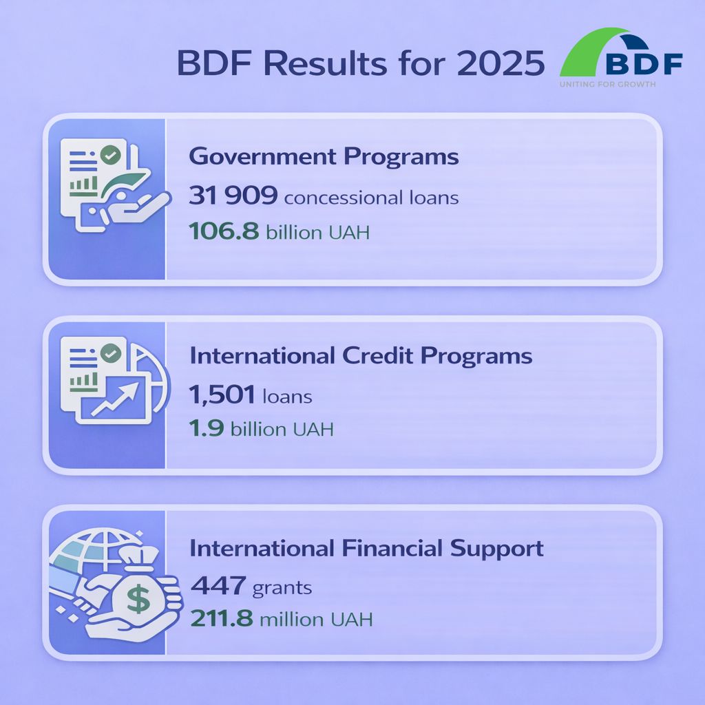 In 2025, the Business Development Fund (BDF) continued to play a pivotal role in Ukraine’s system of state support for micro, small, and medium-sized enterprises (MSMEs), ensuring access to finance amid the full-scale war and persistent economic challenges. Through a broad portfolio of state and internationally supported programs, the Fund contributed to business continuity, resilience, and recovery across key sectors of the economy.